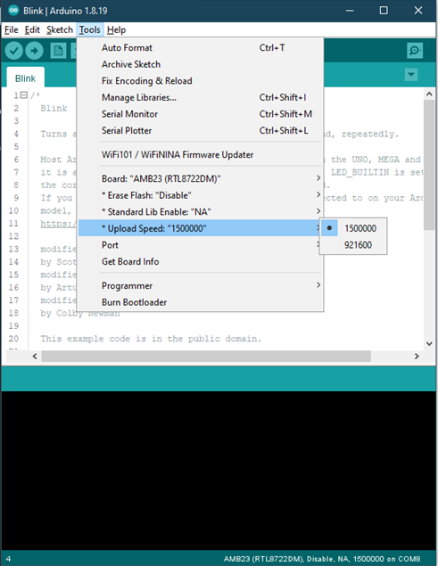 安装运行成功后,您可以打开Arduino IDE并选择 “Tools” -> “Board” -> “Ameba ARM (32-bits) Boards” ->” AMB25/AMB26 (RTL8720DF)” 来选择AmebaD作为当前连接的开发板。