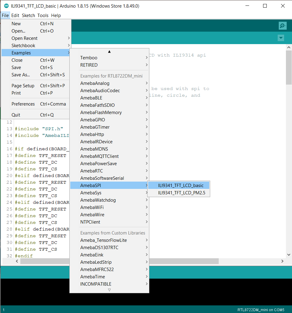 打开范例程式, “File”→ “Examples”→ “AmebaSPI” → “ILI9341_TFT_LCD_basic”