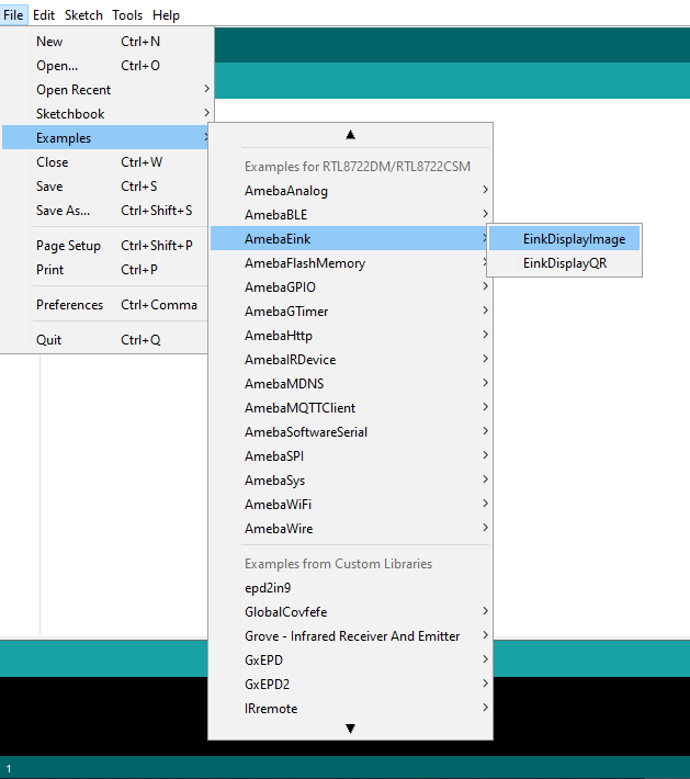 Then install the AmebaEink.zip. Open the “DisplayQR” example in “File” → “Examples” → “AmebaEink” → “EinkDisplayImage”: